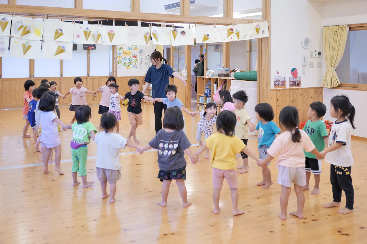 音楽に合わせて体を動かしたり、季節の製作や描画・散歩などを行います。